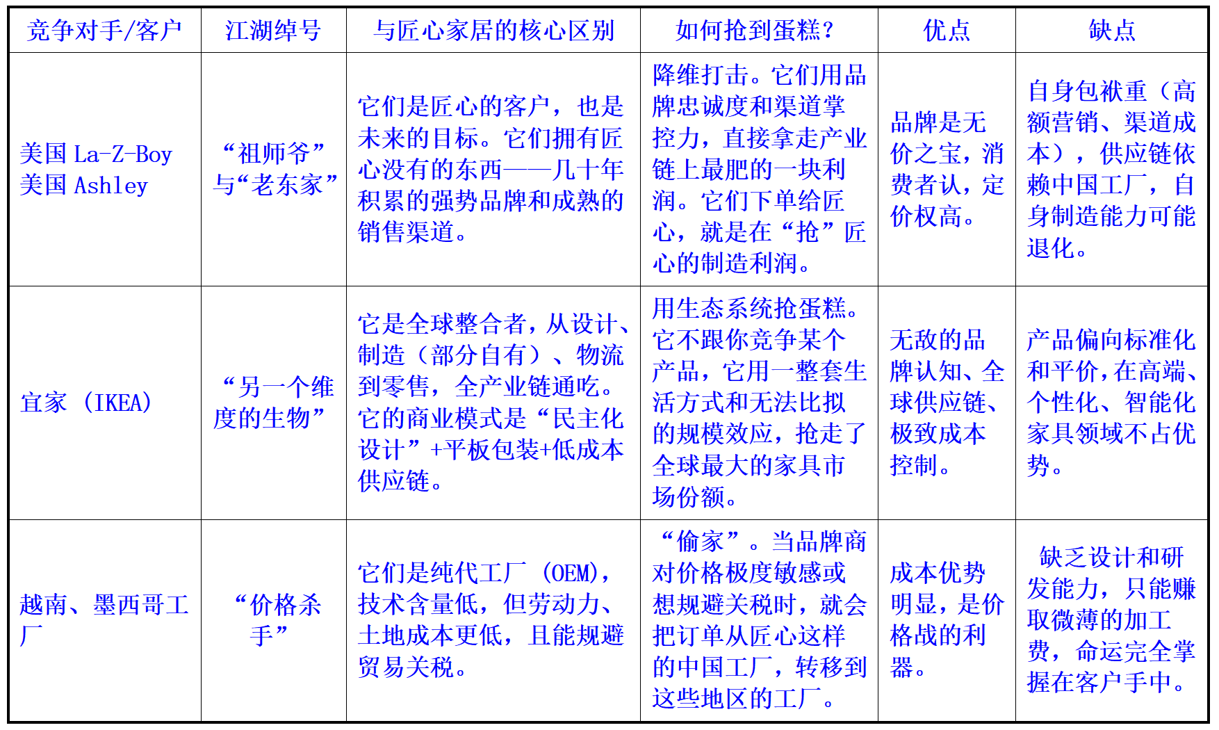 总而言之,匠心家居是一家手艺非常好的“老师傅”,但它把自己的命运寄托在了少数几个“大主顾”身上。它的技术是它的护城河,但这条河还不够宽、不够深。它在兢兢业业干活的同时,必须时刻提防着“大主顾”变心,以及旁边虎视眈眈、要价更低的“新学徒”们。