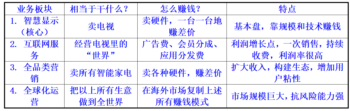 “它主要靠卖电视和各种智能硬件作为基础,然后把卖出去的每一台智能设备都变成它放在用户家里的一个‘小金库’,通过里面的广告、会员、付费内容等互联网服务,细水长流地、持续地赚钱。同时,它在全世界范围内干这件事。”