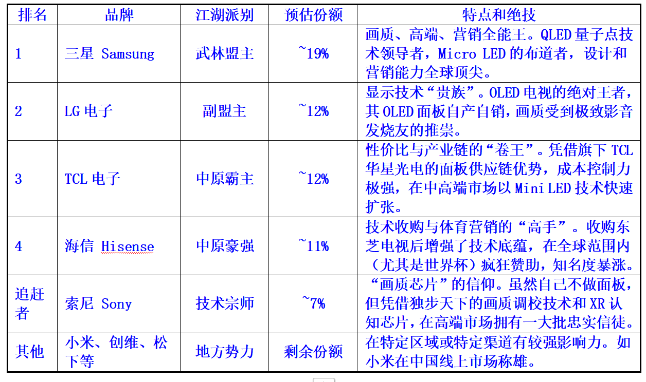 江湖地位:目前市场份额最大、最主流的高端技术路线。TCL、海信等也都是这个阵营的重要玩家。