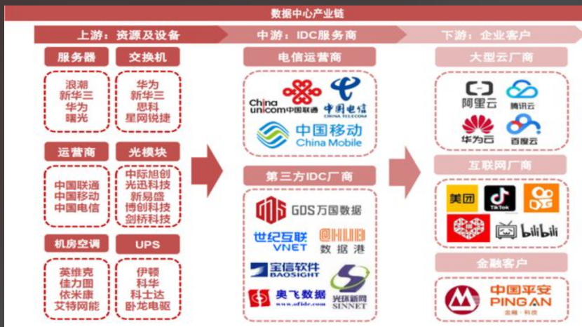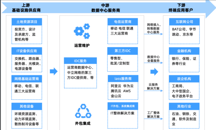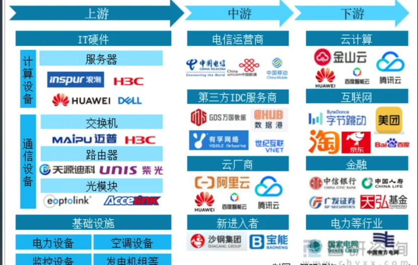 整个链条可以分为 上游、中游、下游 三部分。数据港自己,正处于中游的核心位置。