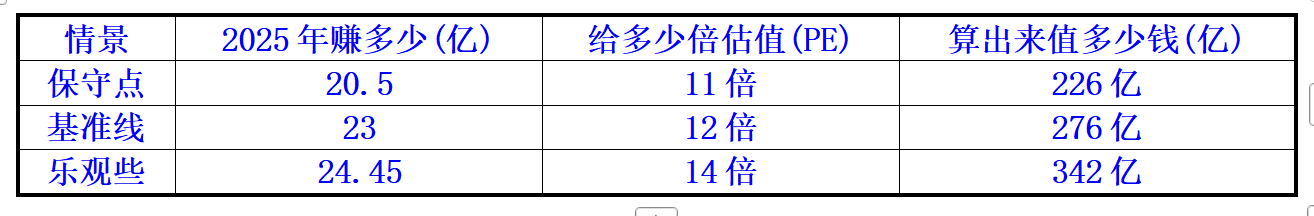 以前和现在:之前用这个逻辑算,觉得它值216亿港元。现在因为它明年赚的钱(净利润中枢)从18亿上调到23亿了,所以合理总价值也跟着水涨船高到 276亿港元(23亿 × 12倍)。