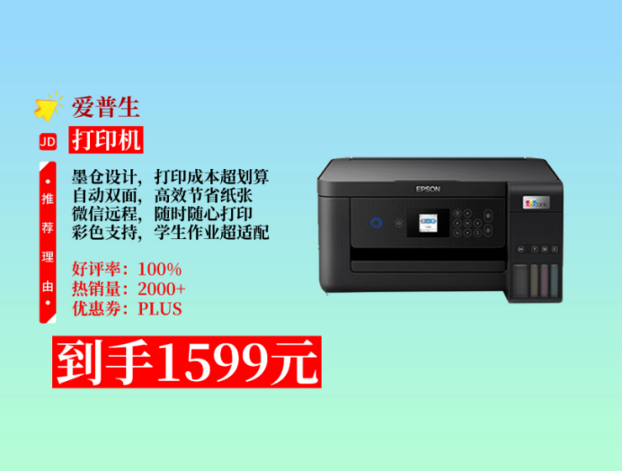 (3) 结果就是“又省又好”:正因为喷头耐用,爱普生才敢大力推 “墨仓式”(原厂连供),让你用便宜大碗的原装墨水,打印成本极低,同时还能保持高精度。