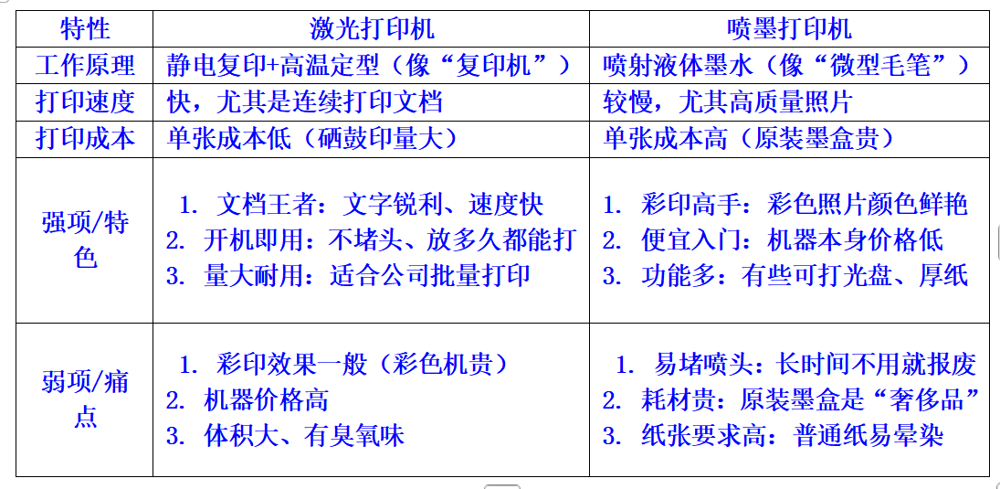 (1) 选激光打印机如果: 你主要打印黑白文档(学生作业、办公文件),求快、省心、耐用,打印量不小。