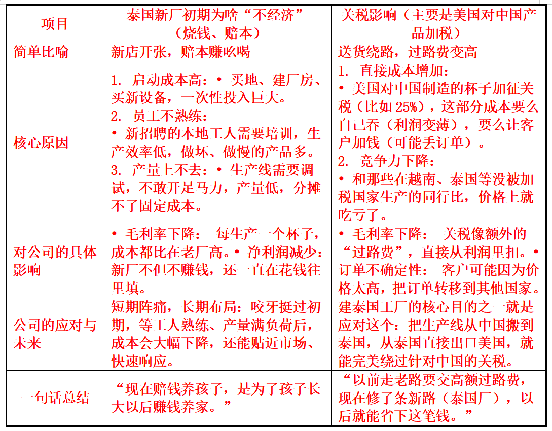 这就好比投资一家正在扩建旗舰店的餐厅:装修期间(泰国建厂)营业额下降、噪音大(利润差),但一旦装修完开业,位置更好、环境更佳(规避关税、成本降低),可能客流量和利润都会上一个新台阶。你现在要判断的是,它的装修团队靠不靠谱,能不能按时按质完工。就是帮你分析装修可能遇到的各种问题和成功后的蓝图。