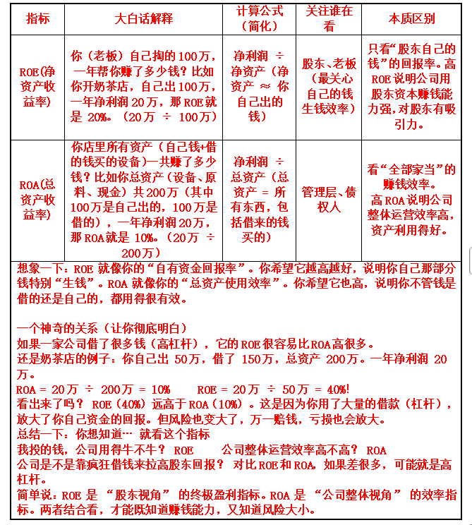 ROE(净资产收益率,就是你投入的钱,公司能帮你赚回多少比例):