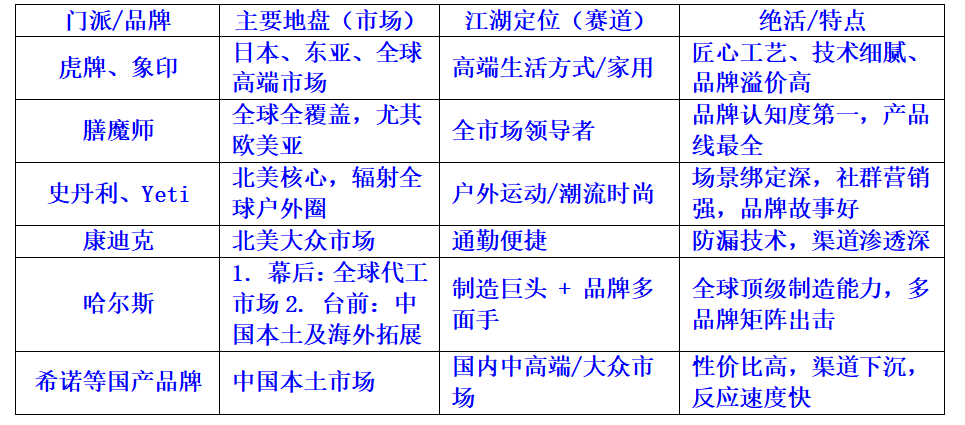 全球综合性品牌巨头:Thermos(膳魔师)、 Zojirushi(象印)、 Tiger(虎牌)。它们在全球,尤其在亚洲和北美,拥有极高的知名度和信任度。