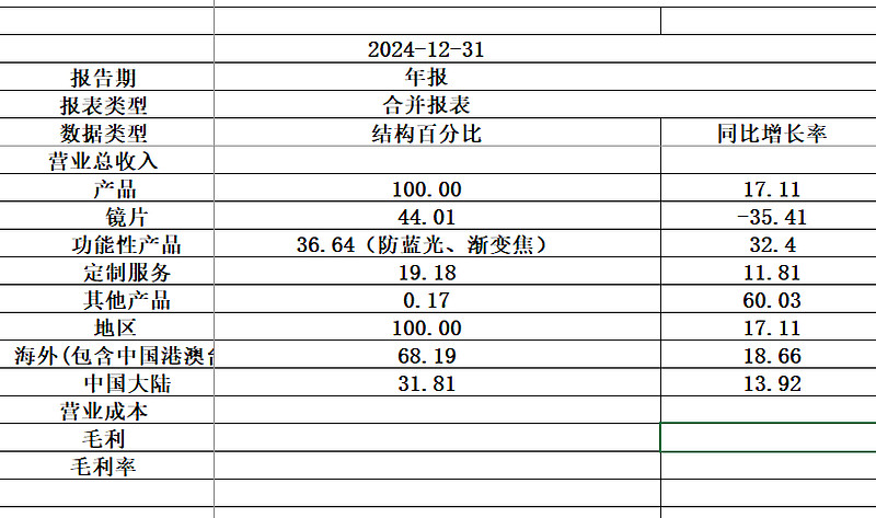 1. 产品越来越高级:不停卖更贵、功能更强的镜片(比如防蓝光、渐变焦)。2024年功能镜片收入占了36.6%,增速高达32.4%,是主力增长引擎。