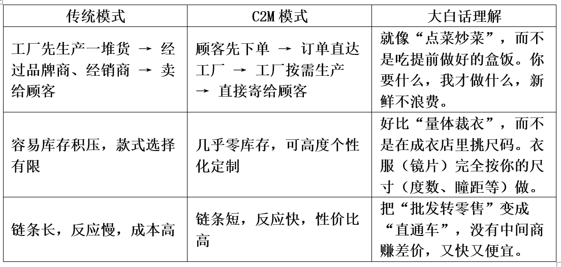 超柔性生产线:能生产700万种不同规格的镜片(SKU),并且接到个人定制订单后, 2-3天就能做出交付(C2M模式)。这速度和柔性生产能力,很多对手做不到。
