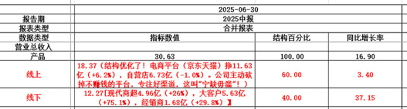 线上:18.37亿,同比+3.4%,看着不快,但结构优化了!电商平台(京东天猫)挣11.63亿(+6.2%),自营店6.73亿(-1.0%)。公司主动砍掉不赚钱的平台,专注好渠道,这叫"宁缺毋滥"!
