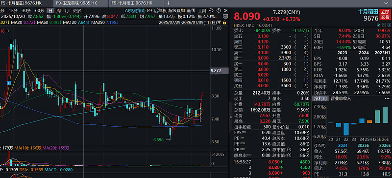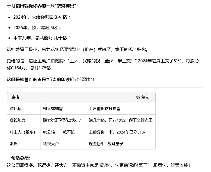一句话:现在买十月稻田,相当于花五菱宏光的钱,买了一台配置堪比宝马的车。市场还没反应过来,等大家意识到这不是个普通卖大米的,而是个有品牌、有渠道、有新品的新消费龙头,估值从10倍PE涨到15-25倍,股价至少50%-100%的空间。