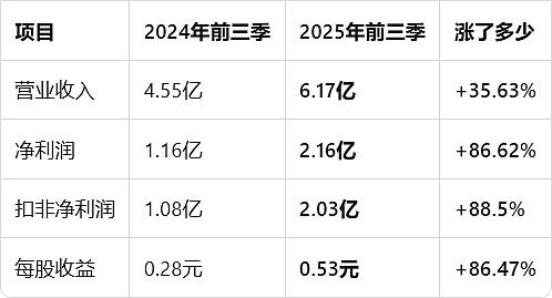 用人话讲:去年前三季度挣1.16亿,今年同样的时间干了2.16亿,利润快翻倍了!更狠的是,这利润增速(86%)比收入增速(35%)快了一倍还多,说明啥?说明赚钱效率爆表,不是光靠多卖货,而是每卖一件赚得更多了。