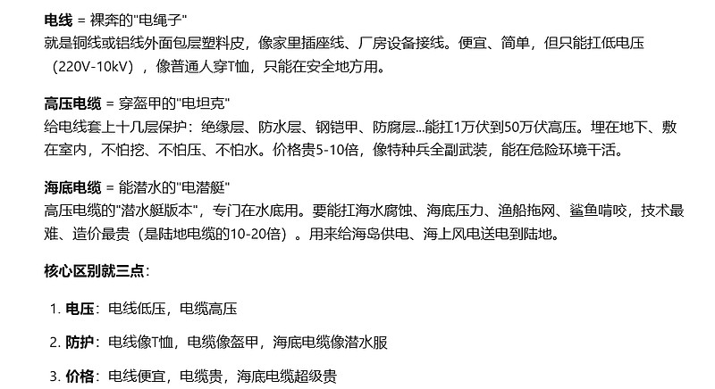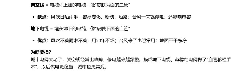 大白话:电网就像人体血管,4万亿投资要把"老旧血管"(架空线)换成"新血管"(地下电缆),汉缆就是造血管的。