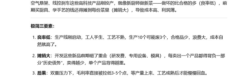空气悬架、线控刹车这些高科技产品刚投产,良率低、摊销大:占比只有10%,没有多少