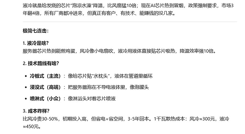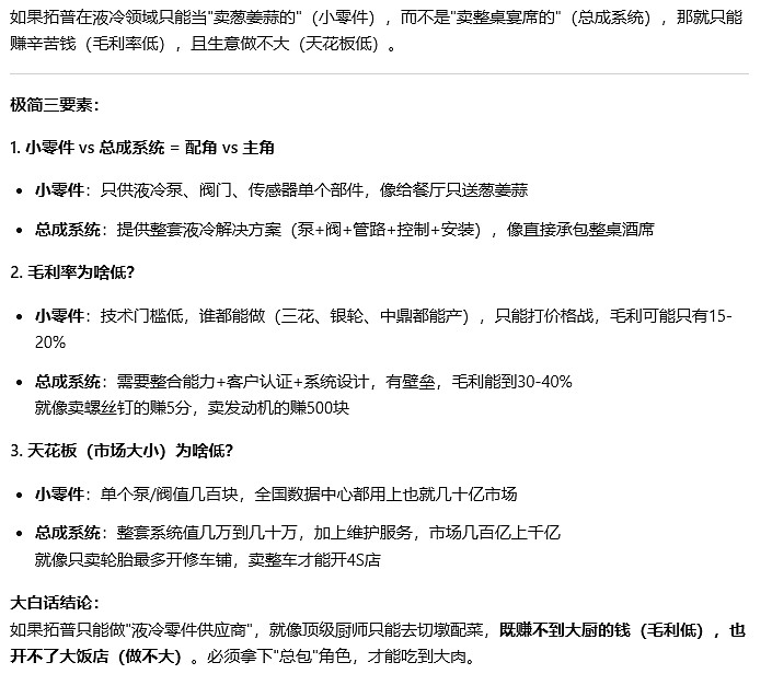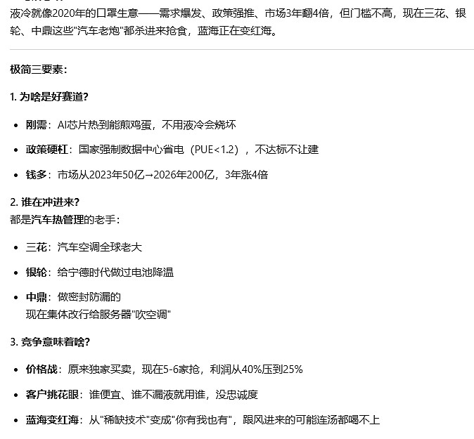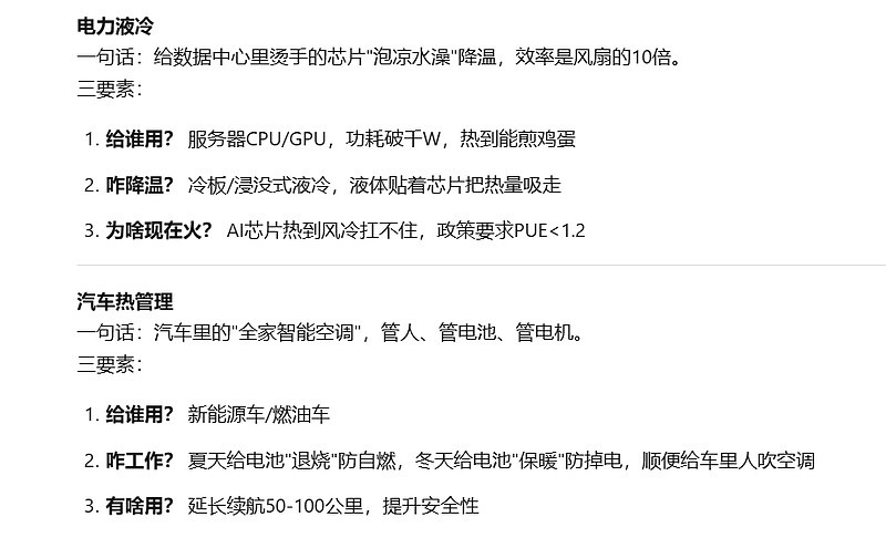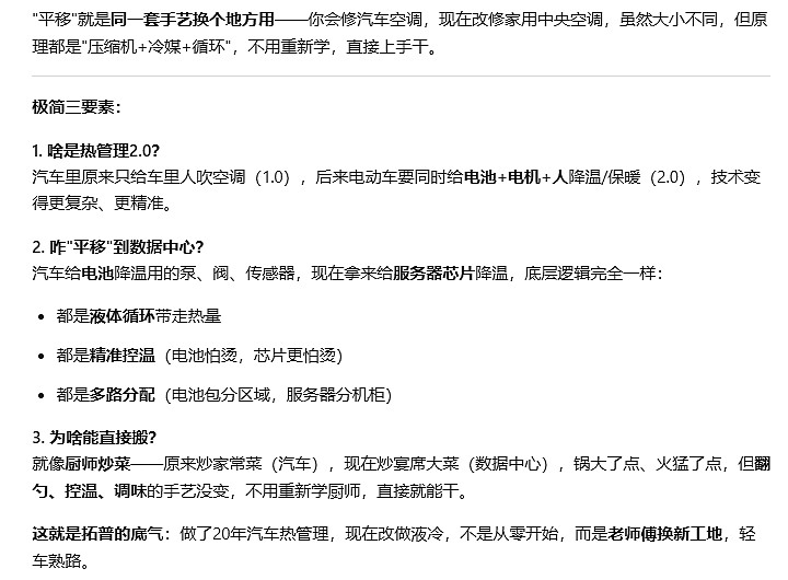 液冷就是给数据中心、AI服务器、储能设备"吹空调"。拓普把给电动车做热管理的技术,复用到这些新场景。