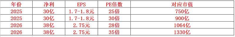 2026年:20-30倍PE,考虑了新业务弹性,增速在20%,PEG在1.5,利润在35亿,市值1050亿,今天1445亿,利润38亿,PE30倍,市值1140亿,PE25倍950亿