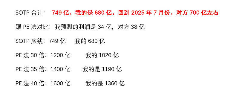 SOTP合计: 749亿,我的是680亿,回到2025年7月份,对方700亿左右