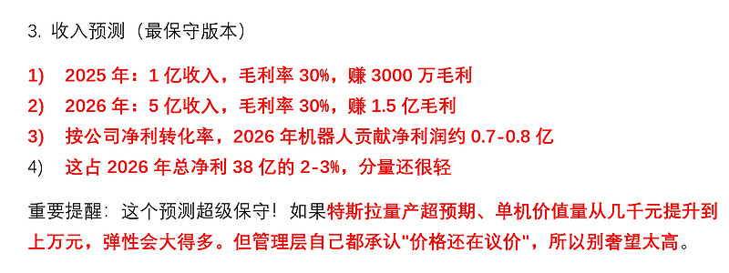 重要提醒:这个预测超级保守!如果特斯拉量产超预期、单机价值量从几千元提升到上万元,弹性会大得多。但管理层自己都承认"价格还在议价",所以别奢望太高。