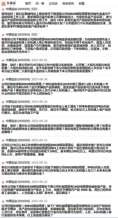 $中国宝安(SZ000009)$ 互动易上的问题不是理论上3天就要进行回复的吗?如果是虚假信息,要谣言止于智者,也不能放任小作文横行霸道!还网络一片清朗之地!请宝安的工作人员尽快答复,不要让投资者给未经确认的信息误导! 以下提问中有多少事件为虚假?$国际精密(00929)$ $优必选(09880)$ @港股股怪