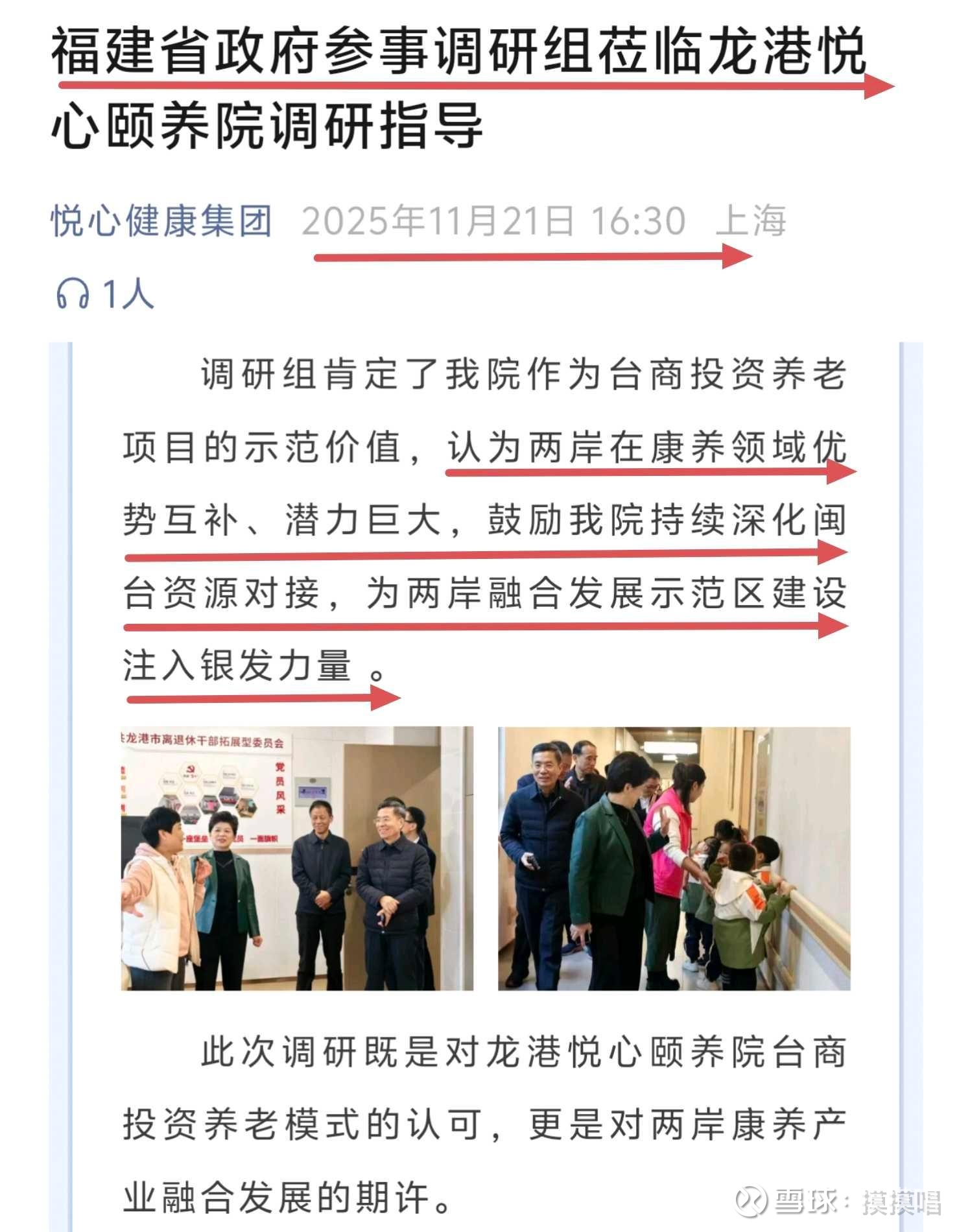 2025年11月21日,福建省政府参事调研组到悦心调研指导。调研组肯定了我院作为台商投资养老项目的示范价值,认为两岸在康养领域优势互补、潜力巨大,鼓励我院持续深化闽台资源对接,为两岸融合发展示范区建设注入银发力量。
