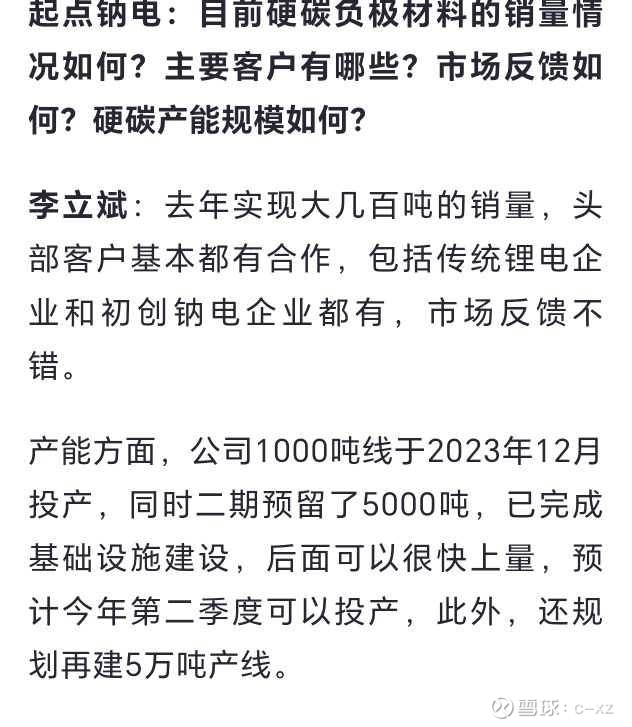 回复@c-xz: 12月底向公司了解过硬炭的方面的情况,现在产能大概是6000吨左右,子公司元力新能源碳材料(南平)有限公司年产5万吨新能源硬碳,项目分五期建设,其中一期生产规模为1500吨新能源硬碳(中试生产),二期全厂达到1万吨/年,三期全厂达到2万吨/年,四期全厂达到3万吨/年,五期全厂达产,元力股份是比较稳健的,根据市场情况合理投产能,帐上储备着资金,扩产还是比较快的。 2025年硬炭出货量和往年差不多, 预计量是不大的, 我的看法是2025年锂电在低位, 制约纳电池产能,2026年锂电已经在高位,2026年纳电池预计要放量的,宁德时代已宣布,2026年将在乘用车、商用车、换电和储能等领域大规模应用钠电池了。持有这样一个有预期的公司是不会差的,大不了亏点时间,不亏钱的,金子总会发光的。看看那些被炒得高高在上的股,几百倍PE,跌下来可以要命的啊。//@c-xz:回复@南海淘金:按去年三月份这份采访,硬碳应该已经有6000吨了 查看图片