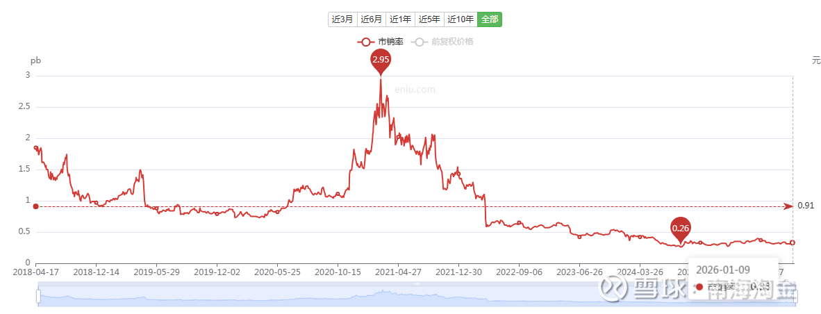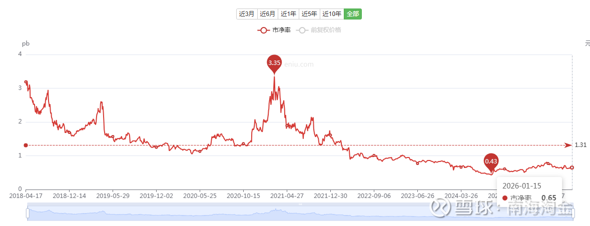 1、截至今天收盘,股价为6.37元,市值54亿,市净率0.67,为上市以来的低位。