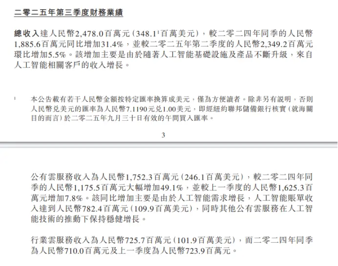与此同时,面对AI浪潮,金山云围绕人工智能全面升级基础云和智算云,已初步构建了全栈AI技术能力。受益于此,金山云生态内外客户用量同步攀升,2025年第三季度,智算云账单收入达7.8亿元,同比增长近120%。