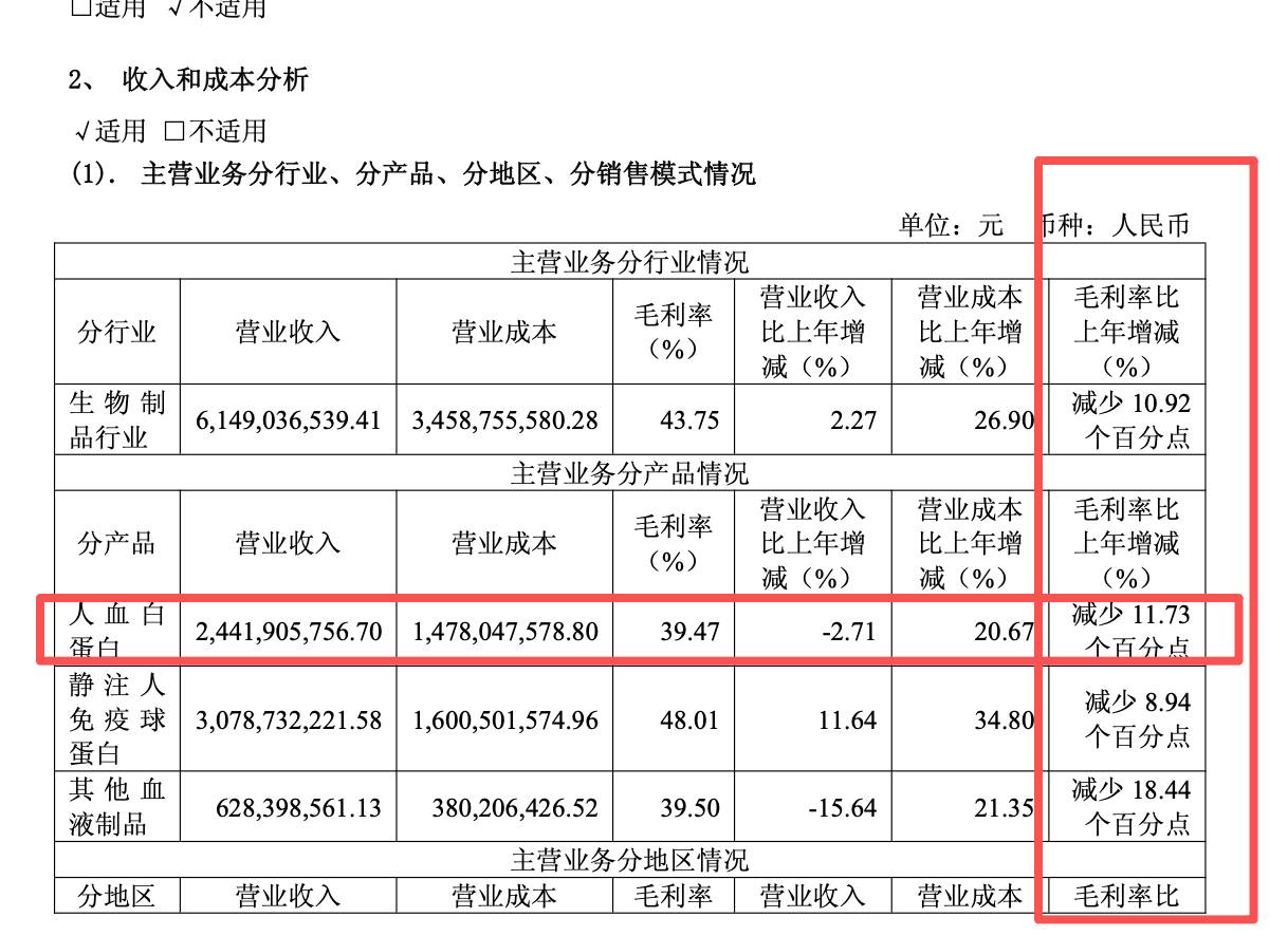从业务上看,问题最大的还是白蛋白,它面临三个压力:1、进口白蛋白碾压,别人生产成本只有国内的一半,就看进口的比例决定压力程度;2、稻米造血这种重组的技术路线,只是这种影响比较慢,适应症少,要慢慢儿上压力;3、医保控费,集采压力,看上面的毛利率下降,也是这样来的。