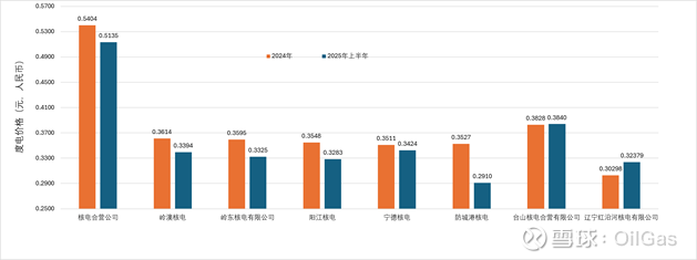 然后参照各个核电站的上网电量,即可做出如下度电价格图并与2024年全年对比: