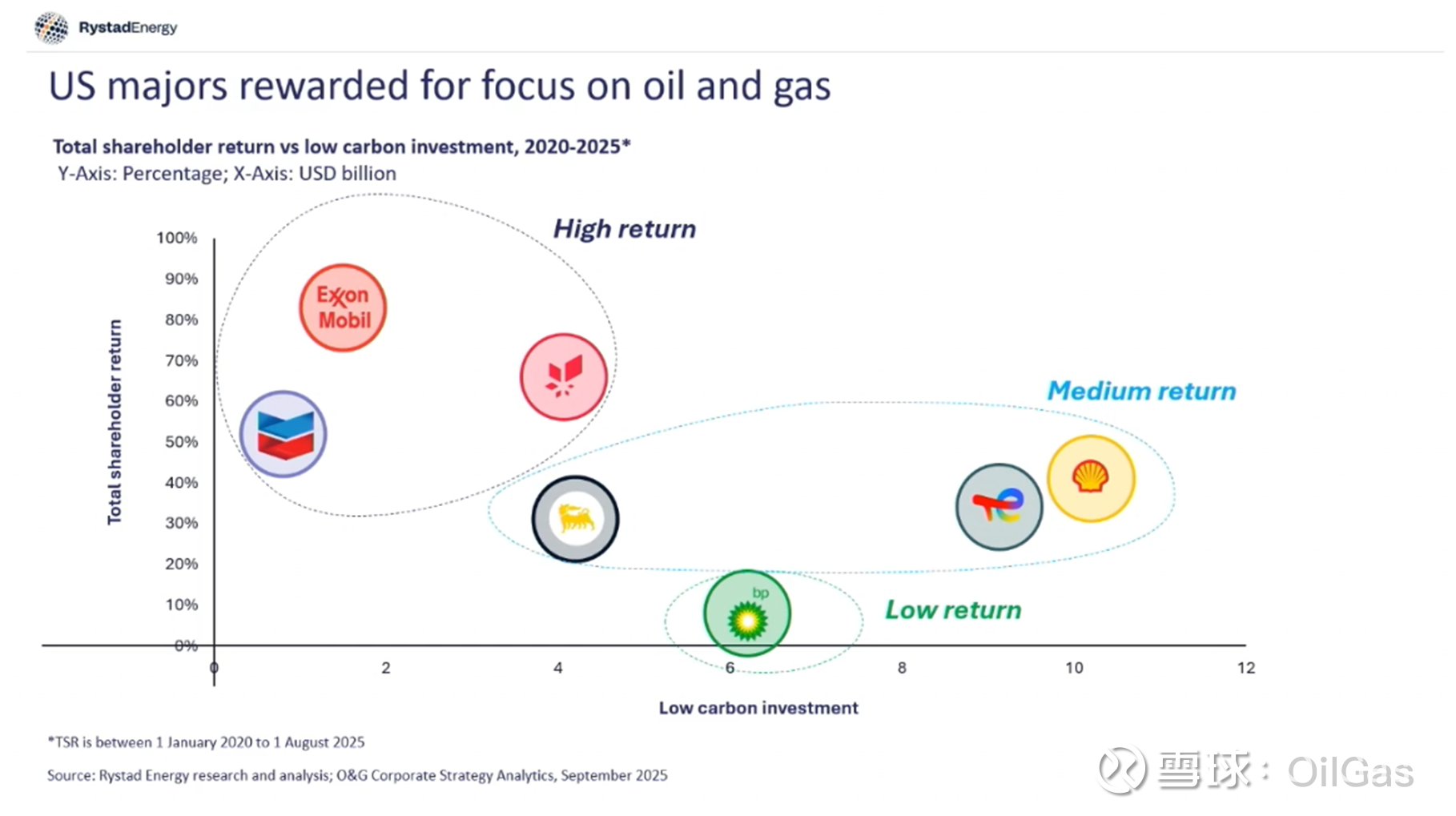 第一张图说明投资在低碳领域投资额低的石油公司,过去5年的股东总回报(total shareholder return)会高一些。至于为什么,是因为新能源领域的商业模式与传统石油天然气是不同的,而且石油公司在这片红海中竞争并没有什么优势。