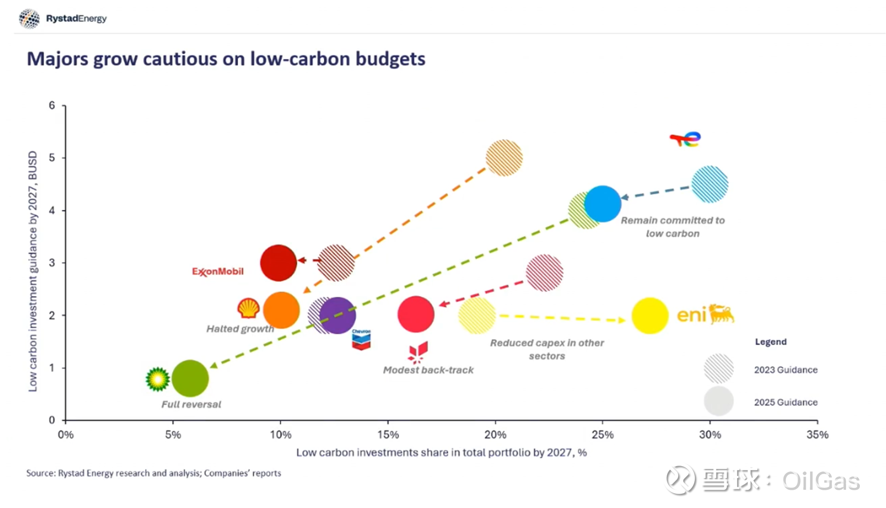 第二张图说明所有石油公司的低碳领域的投资比例与2023年的指引相比,2025年的指引中的比例都在下降投资。