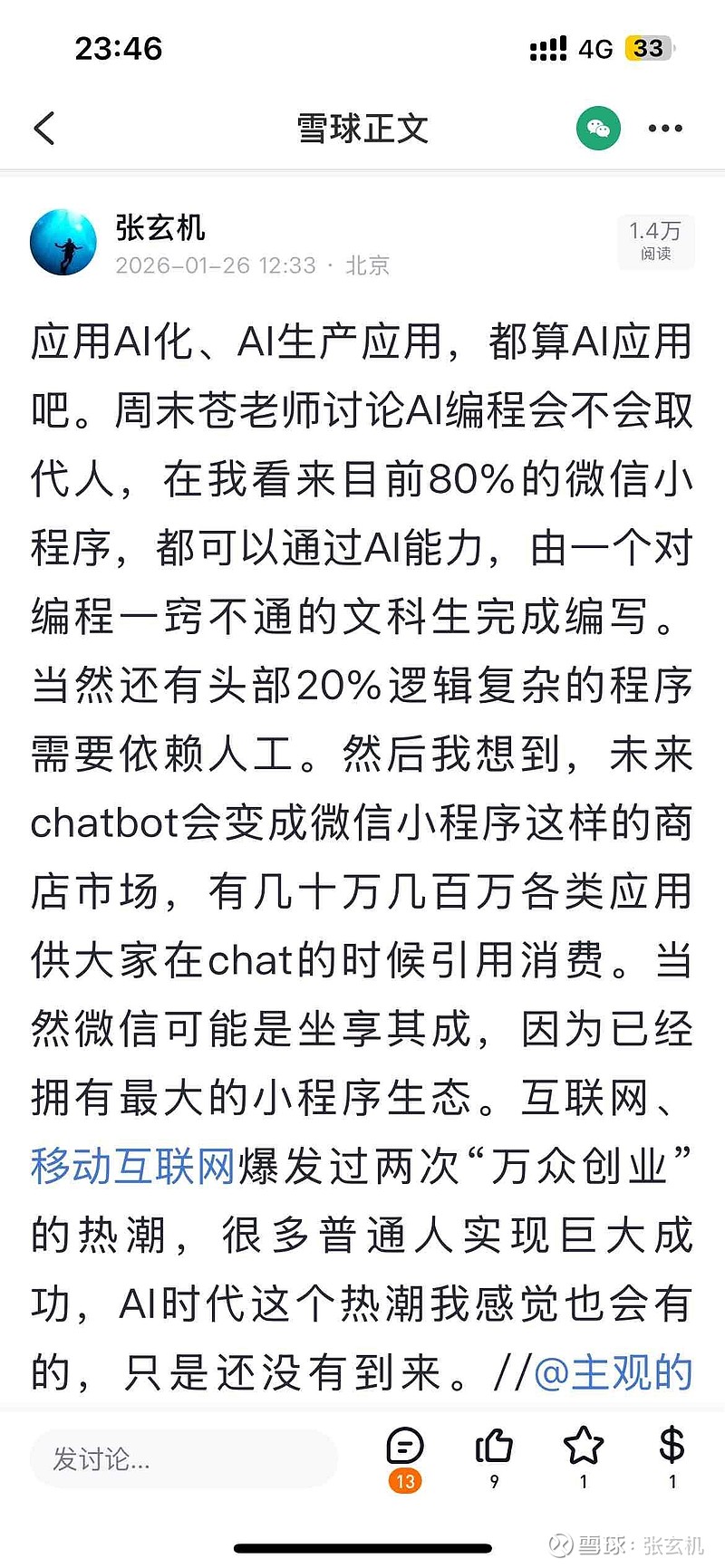 这次的龙虾热潮,甚至很多地方政府拿出政策资金去造势,包括微信计划推出的基于小程序的AI服务, 让我感受到一点这股热浪了。AI应用有可能像移动支付一样,发轫并非在中国,但最后有且仅有中国实现了全民AI普及、全民AI普惠。
