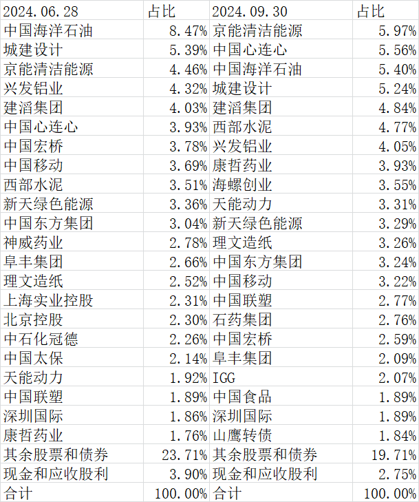 基于一贯的低估值分散轮动投资策略,第三季度减仓了$中国海洋石油(00883)$ 、中国宏桥、上海实业控股、中石化冠德、北京控股等,清仓了中国太保、神威药业、中国银河等,加仓了京能清洁能源、中国心连心、海螺创业、西部水泥、康哲药业、石药集团、天能动力、中国联塑、金斯瑞生物科技等。兴发铝业减仓后又无奈加回。