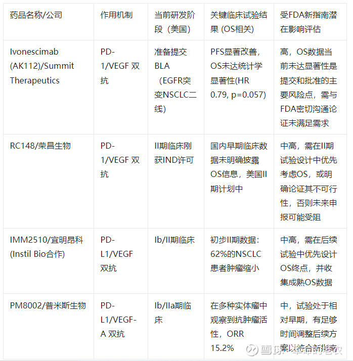 OS数据的成熟度是关键:对于像Ivonescimab (AK112) 这样已准备提交上市申请的产品,尽管其PFS数据优异,但OS未达到统计学显著性是一个潜在的风险点。FDA在新指南下可能会要求更长时间的随访或更多的支持性证据。