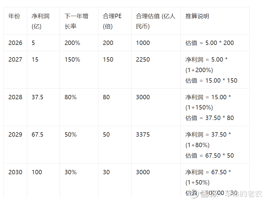 高速增长期(2026-2027):公司享受200倍和150倍的超高PE,估值从1000亿快速提升至2250亿,驱动力是净利润的爆发式增长(200%、150%)。