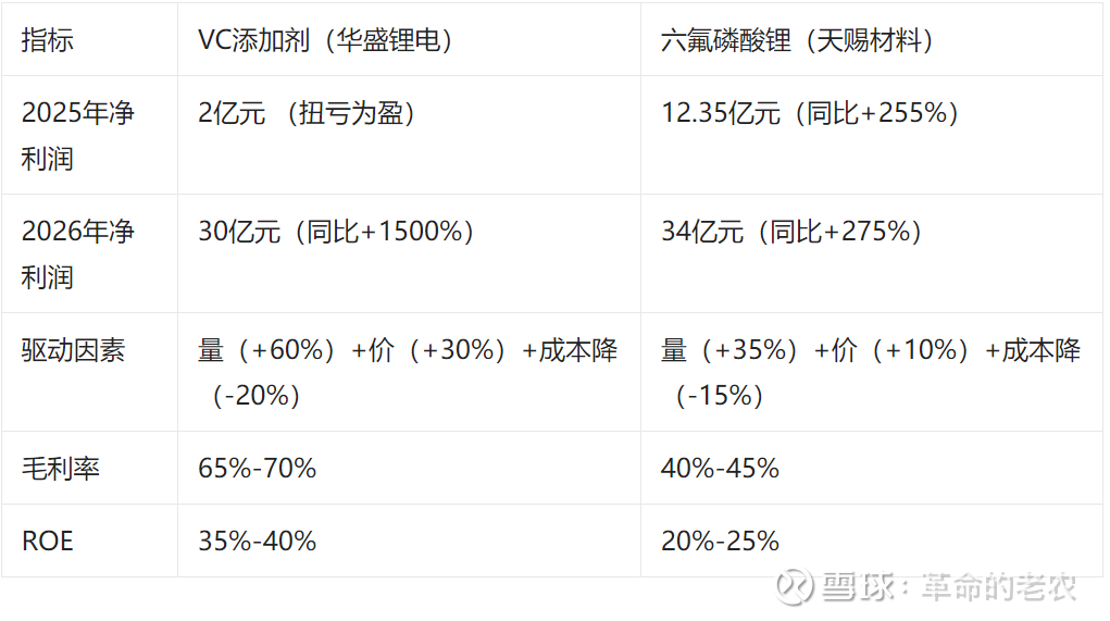 从2026年Q1起,VC添加剂(碳酸亚乙烯酯)与六氟磷酸锂(LiPF₆)的业绩增长将呈现显著分化: