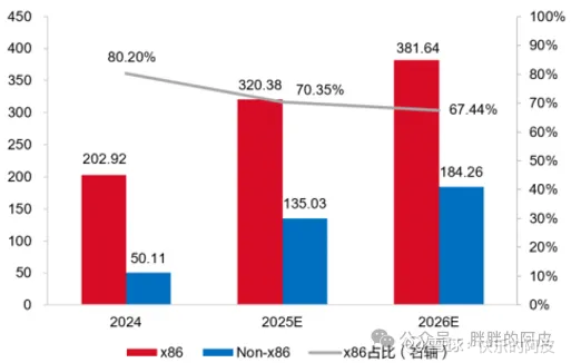预测CPU的X86和非X86的市场规模: