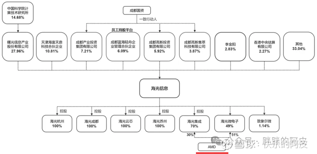 公司无实控人,中科曙光为母公司,持股28%,中科曙光背靠中科院妥妥的硬实力,员工持股平台持股11%,成都国资委持股合计持股23%,李金阳(赤峰黄金老板)持股2.8%。AMD持股其中两家子公司,海光集成、海光微电子。
