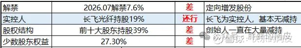 长飞第一大股东且为实控人,前十大股东 持股39%,2026年7月有7.6%的定向增发股份解禁,这些筹码的盈幅已经很大,必然会进行减持,创始人已经退出,一直在减持,目前还有8%股份为第二大股东;