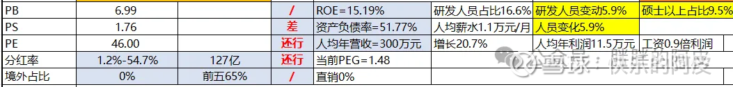 ROE15%,研发人员占比17%,其中研发人员中硕士以上占比9.5%,30-40虽之间人员占比43%,从这个构成上来讲,研发力度应该偏向与制造业配合研发;2024年研发人增长6%,整体员工增长6%,小幅稳定增长;资产负债率52%还是偏高的;人均营收是不错的,利润还行;分红比例55%;