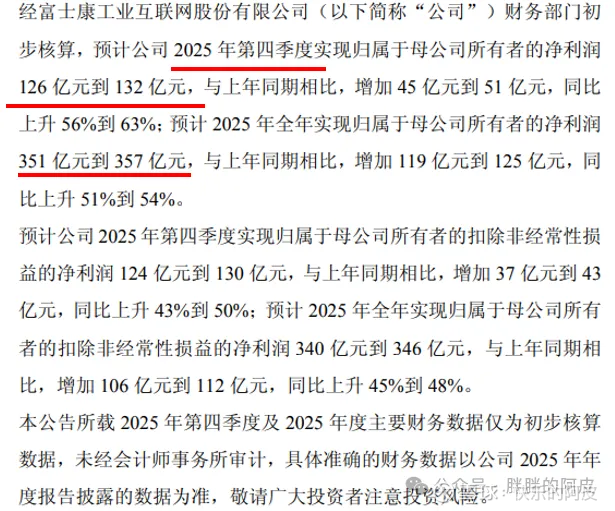 2025年预告已出,归母利润351-357亿,同比增长51%-54%,云服务商服务器同比增长1.8倍,800G以上高速交换机营收增长13倍;2025年的业绩基本符合预期,这种航母级别的代工厂,这种增长速度,可以想象到北美那些云厂商这个扩张规模有多可怕,大致反算了下,2025年营收约8900亿左右,按2025年预测估值30,这样来看估值肯定是高的,要对2026年有所预期,这样就会好很多;