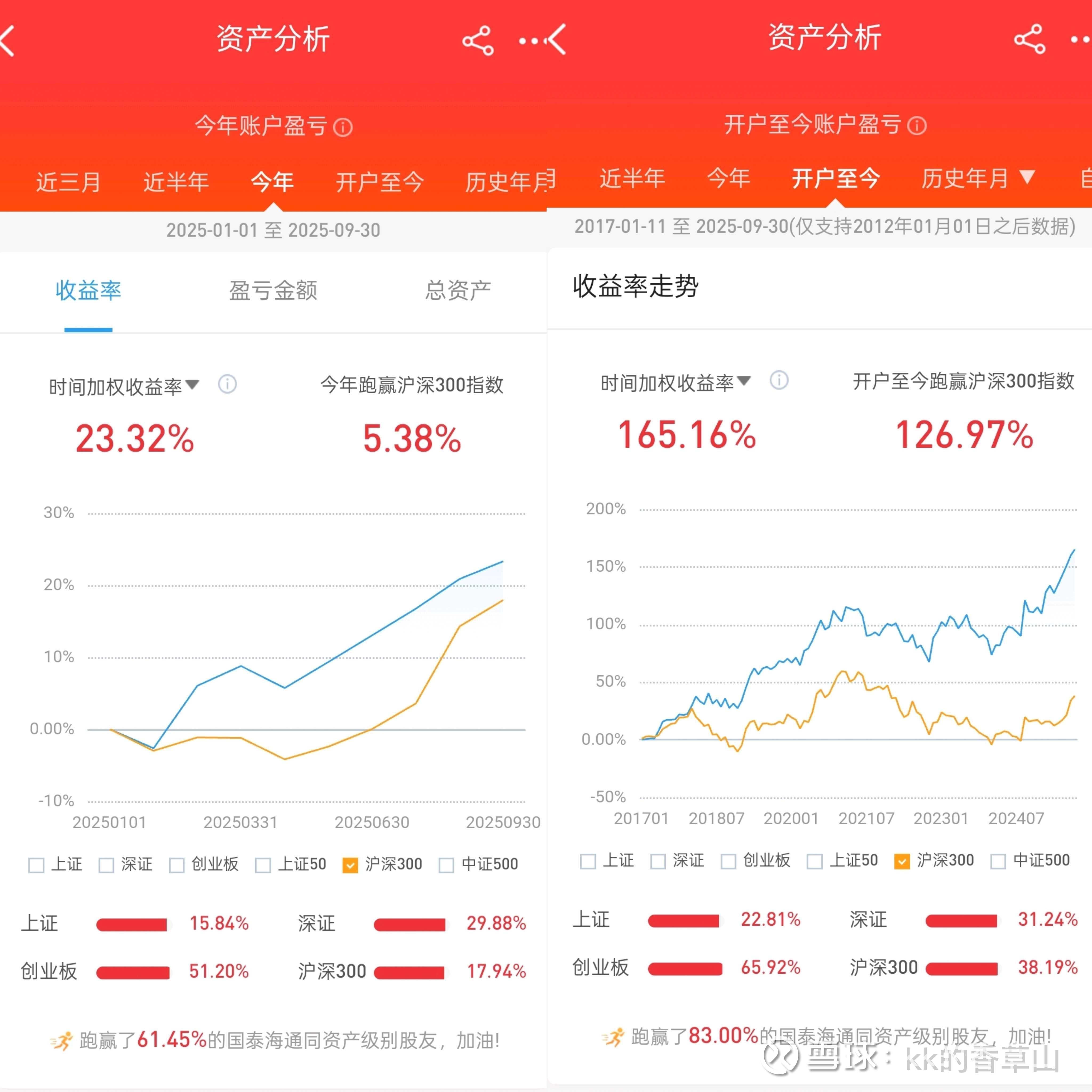 截至2025年9月30日,今年以来,我的主账户投资收益率为23.32%,跑赢61.45%国泰海通证券同资产等级的用户,跑赢沪深300指5.38个百分点。2017年账户有投资记录以来,收益率为165.16%,跑赢83%国泰海通证券同资产等级的用户,跑赢沪深300指126.97个百分点。