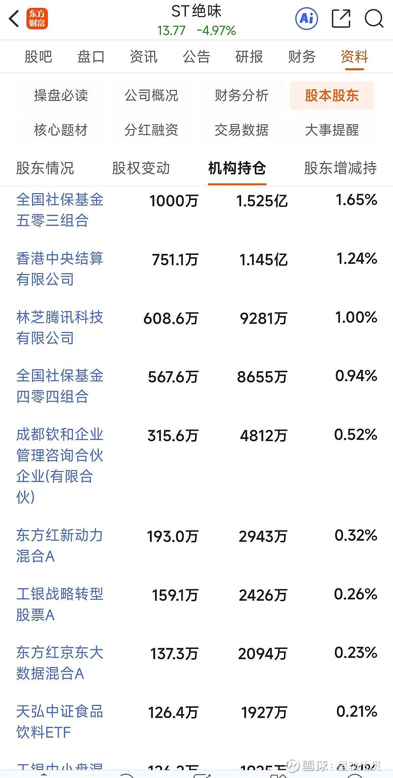 $ST绝味(SH603517)$ 这个票,看看十大股东就烦人,跟别的还不一样。里边有两个社保基金,跟诺泰一样。跌的深翘板的话短线想参与可以参与,中线持仓我觉得是不着急买的,社保基金一下子出不完,还有里边有一大堆公募、比如食品饮料etf等,他们都不会持有st票的,开了以后应该还有一个寻底的过程,如果做中长线可以等2-3月再说。