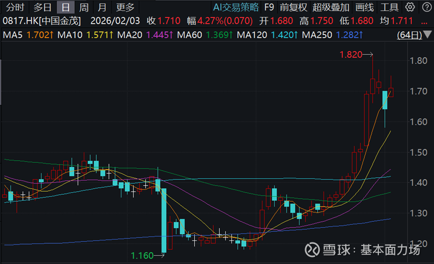 再比如打造了高端品牌金茂府的中国金茂(0817.HK),更是不得了,在今年1月下旬连续拉出近10根阳线,股价从2025年底的1.21港元,飙涨到一月底的1.73港元,乖乖,50%了!