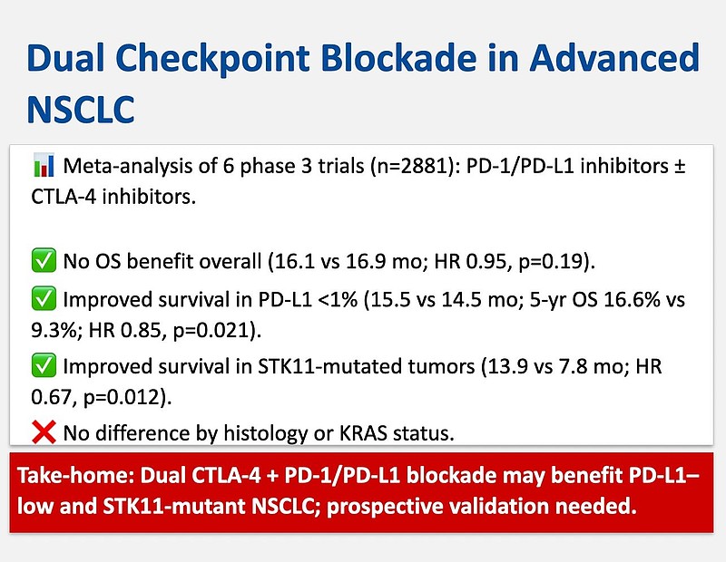 $康方生物(09926)$ 搞懂为什么跌了,昨天《柳叶刀》刊出一篇文章 DOI: 10.1016/S1470-2045(25)00429-2 ,讨论在PD-(L)1之外联用CTLA-4对比单独PD-(L)1在治疗NSCLC上有没有额外的获益,文章对历史上的三期临床试验做了一个分析的分析,结论是没有。mOS 联用16.1和单用16.9 HR 0.95 [95% CI 0.87–1.03], p=0.19