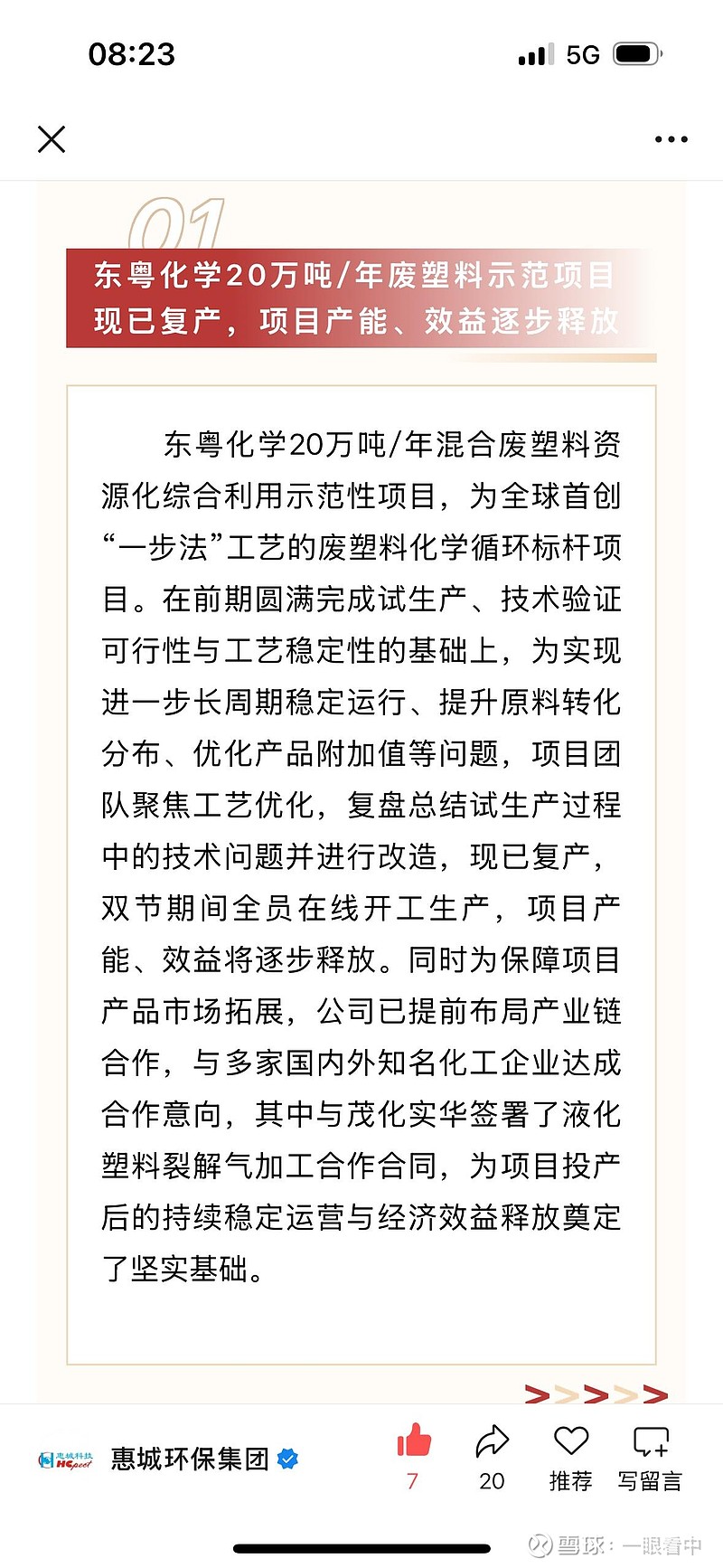 然而,近两日我们关注到市场上出现关于公司20万吨/年混合废塑料资源化综合利用示范项目复产负面传言及讨论。🔥公司对此明确声明相关言论与事实严重不符。东粤化学公司一直按计划推进项目技术升级改造,现已复产,项目产能、效益将逐步释放。公司对该项目的长期稳定运营充满信心,也将持续聚焦技术更新,以期最终实现项目的经济效益、环保效益与社会效益。公司也将实时公开发布进展信息,敬请各位投资者关注。