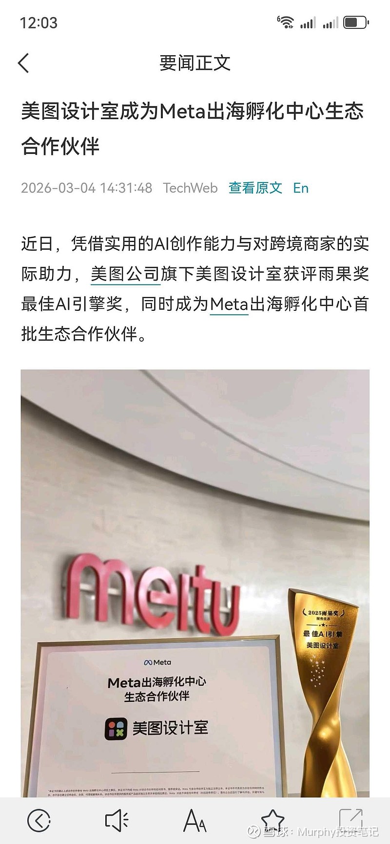 $美图公司(01357)$ 祝贺美图设计室成为Meta出海孵化中心生态合作伙伴,融入巨头生态成为得力工具。Meta出海孵化中心是Meta在中国跨境电商市场布局的首个线下战略载体,后续美图设计室将与Meta官方营销专家、雨果跨境团队等协作,为入驻企业提供建站、物流、支付、营销、合规等方面的专业服务。