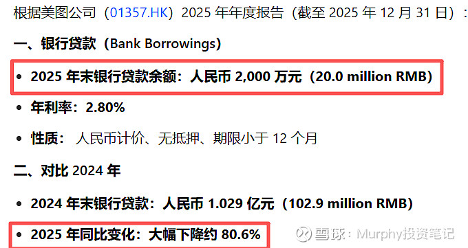 $美图公司(01357)$ 看看年报,美图2025年的银行贷款仅有区区2000万元,比2024年的1亿多下降了80%,2025 年末资产负债率(总借款 / 总权益):0.35%,2024 年为 2.04%,优秀亮眼的报表公司,几乎不依赖银行借款运营,财务结构非常稳健。而阿里的可转债,利率也仅有1%,非常划算的一笔。公司不仅安全边际极高,而且公司的营业模式是日日现金,无应收账款,AI不仅带来用户数处于高增长,还带来成本的降低,大模型没有取代美图,而是成为美图业务赋能的养料!