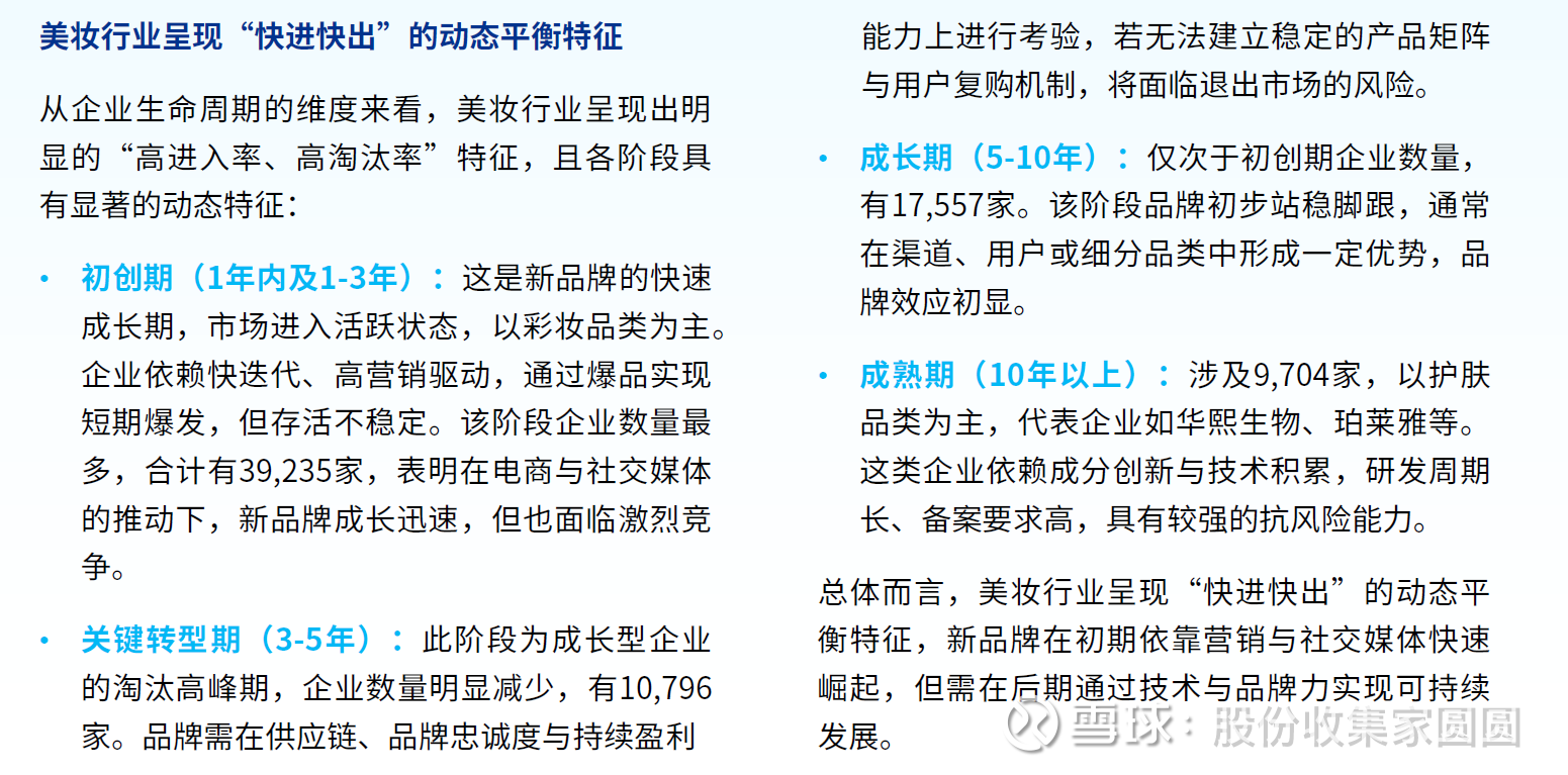 美妆行业企业的生命周期普遍偏短,迈入成熟期门槛以后抗风险能力会更强,这里珀莱雅、上美是代表企业,他们的品牌生命力比较强,也穿越了较长的周期,具备较好的抗风险能力,但主要品牌已经进入成熟发展阶段,难有爆发式增长,更需关注第二曲线的成长性,上美在这方面走得更靠前一些。