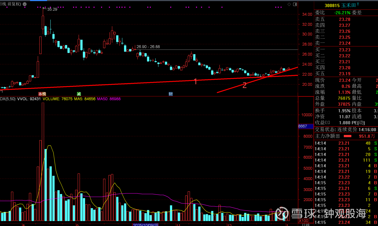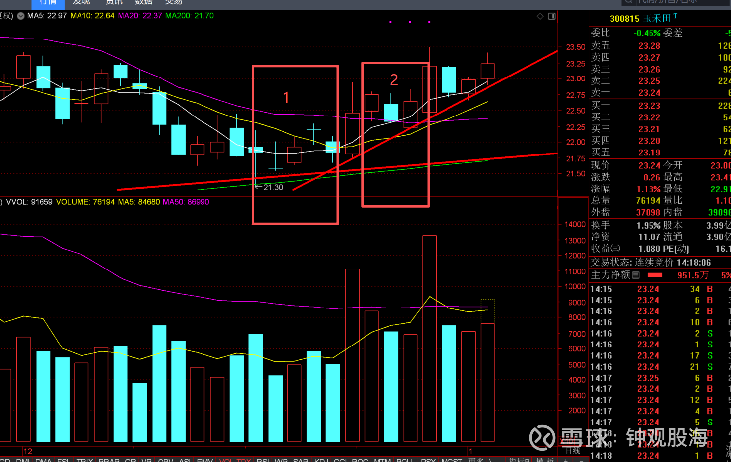 如下图,上升趋势线2斜率比上升趋势线1斜率更加陡峭.有步入主升浪可能。