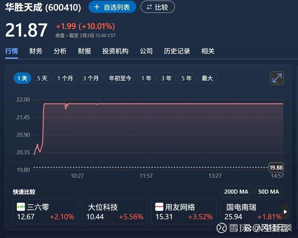 今天(2026年2月3日)A股算力板块彻底炸了!华胜天成(600410)直接封死涨停,收盘价21.87元,涨幅10.01%,成交额43.1亿元,换手率高达18.58%,主力资金净流入16.98亿元!
